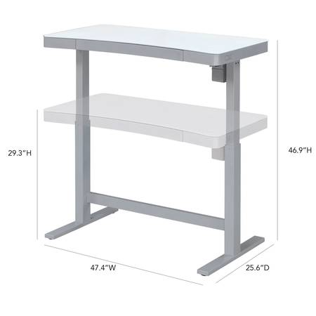 Enjoy the most innovative work space with a desk that adjusts to your needs. The contemporary Ashford™ ActiveLife™ adjustable height desk features a height range from 29.5” to 47”, plus three programmable height settings. Select your desired height with the Illumitouch™ seamless control panel and avoid accidentally adjusting the height with a useful lock button. For a reminder to stand up, set an alert with the GetActive™ timer. Ensure devices stay powered with integrated USB power ports that can simultaneously power up to three devices at full speed. The glass top is dry erase compatible, so you can write reminders or today’s goals in a snap. The large partitioned drawer conveniently stores desk supplies to keep essentials in reach. Best of all, this desk is simple to assemble, so you have more time for the things that matter.