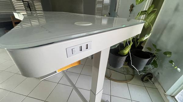 This desk has three height presets, up and down, wireless phone charger and three USB ports to power your personal devices.